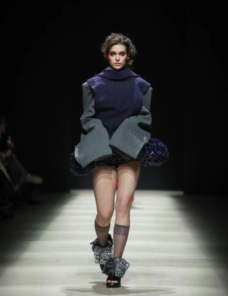 Выпускники «Британки» и Universal University представили коллекции, которые заставляют задуматься. Анастасия Новосельцева в своей работе «Шалости» исследовала феномен «кидалтов» – взрослых, сохранивших в себе ребенка. Ее образы сотканы из личных воспоминаний: здесь и фактурное мамино пальто, и колючий плед, и яркие пайетки с оборками, передающие детский творческий хаос. Следом Мария Световец представила коллекцию «Эффект Пруста», где попыталась визуализировать запахи через ткани. Вдохновением послужили дачные ритуалы, поэтому на подиуме мы увидели сложную многослойность: сочетание уютной вязки и прозрачных летящих материалов. Это была ода тактильности и памяти, где каждая деталь вызывала чувство приятной ностальгии.