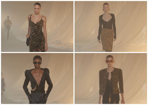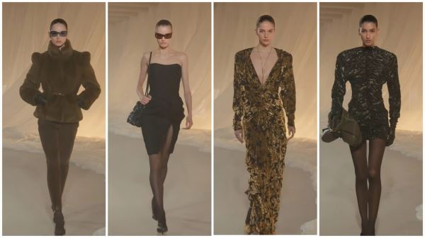 В центре коллекции оказалась концепция «минимальной роскоши» – баланс между сдержанностью и гламуром. В отличие от зрелищной эстетики предыдущих лет, Трон сделал ставку на форму, текстуры и мастерство кроя. Среди ключевых элементов – драпированные платья с глубокими вырезами, кожаные куртки с выразительными плечами, мини-платья с анималистичным принтом и пуховики насыщенных оттенков зеленого.