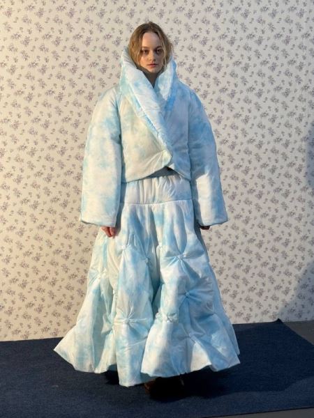 – Мой любимый образ – юбка и блузон «Облако». Он лучше всего отражает суть коллекции. Для меня этот нежный голубой цвет и мягкие фактуры – мое внутреннее ощущение мирного неба. Это то, чего нам всем сейчас хочется: тишины, чистоты и гармонии. В этом наряде модель буквально превращается в облако, легкое и свободное.