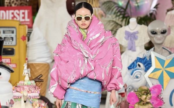 Интересный вариант стилизации представил Diesel — многослойный образ, будто бы «на скорую руку», вызвал радостно-яркое впечатление, благодаря игре палитры.