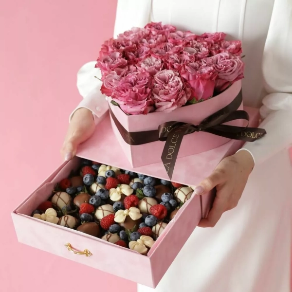 На Flowwow можно найти абсолютно все: нам ко Дню всех влюбленных приглянулись элегантное колье, выполненное из флюорита и украшенное гранеными бусинами глубоких темных оттенков, а также очаровательная бархатная шкатулка, наполненная ароматной клубникой в шоколаде и идущая в комплекте с роскошным букетом пионовидных роз.