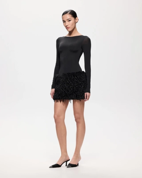 Этот декоративный элемент сейчас в топе трендов, но его достаточно сложно вписать в повседневный образ. Идеальное решение – выбрать платье с перьями для праздника. Обратите внимание на модели с юбкой полностью из перьев или варианты с драпировкой только на рукавах – они выглядят более собранными и менее акцентными.