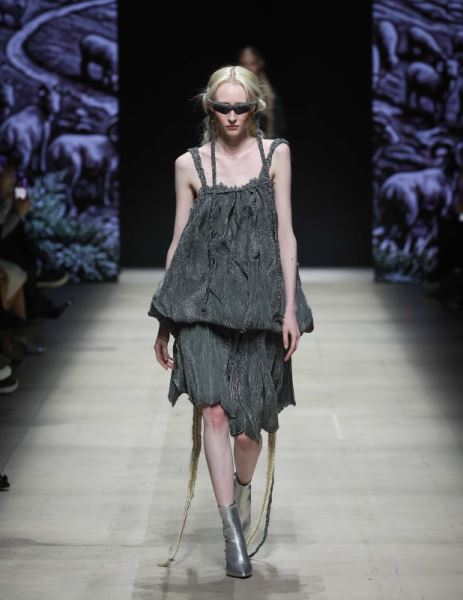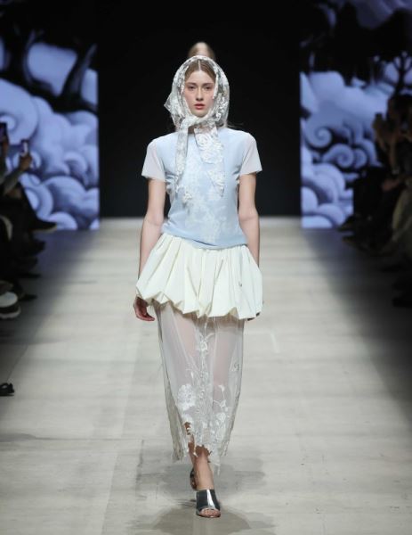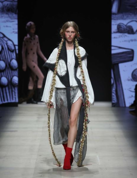 В довольно зрелищной коллекции – адаптированные элементы русского костюма: кружево, плетение, элементы, созданные с помощью техники валяния из шерсти, цифровые авторские принты, эксперименты с цианотипией и кутюрными техниками. Реагируя на действительность, начинающие дизайнеры с удовольствием погрузились в игру смыслов и символов русского костюма, народных сказок, романтизируя образы под современные реалии.
