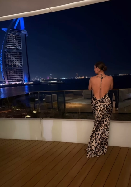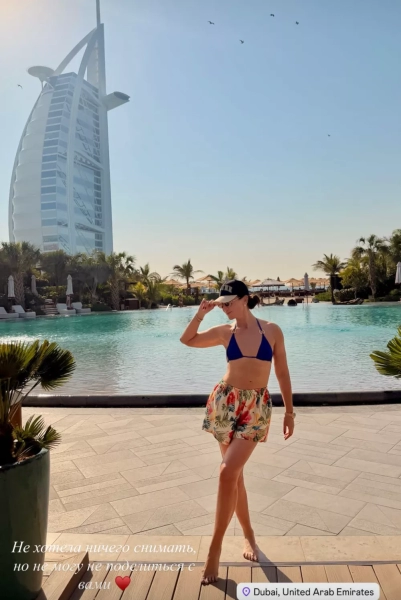 Одним из запоминающихся моментов стала фотосессия на берегу Персидского залива. На фоне культового отеля Бурдж-аль-Араб артистка продемонстрировала стройную фигуру в пляжном образе: раздельный синий купальник на тонких бретелях, цветастые шорты, солнцезащитные очки и бейсболка, которую она изящно придерживала двумя пальцами.