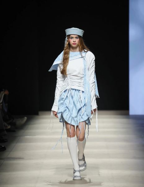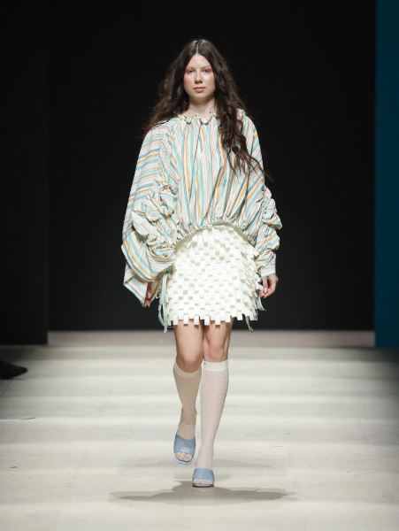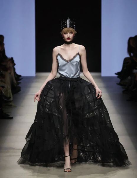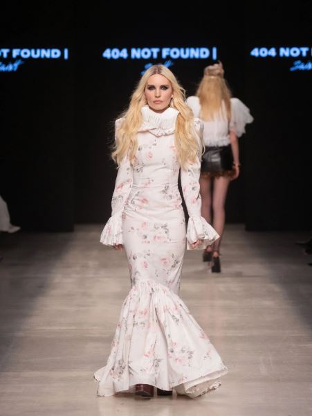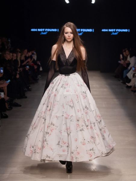 В женских коллекциях внимание привлекли пышные кринолины и панье, а петербургский бренд 404 Not Found продемонстрировал необычную стилизацию горгеры — модного в викторианскую эпоху гофрированного воротника, плотно обрамляющего шею.