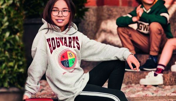 Каждая вещь украшена узнаваемыми деталями и принтами: очками, молнией, гербами факультетов, колбами с зельем и волшебными палочками.