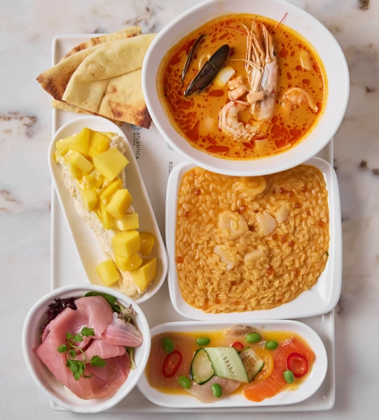 Во всех трех московских точках Atlantica Bistro по будням с 13 до 17 часов сервируют морские сет-обеды (1290 руб.). Точнее, вы их компонуете сами, выбрав любые шесть из 25 позиций специального меню: закуску, салат, суп, горячее, свежеиспеченный хлеб и десерт. Все они – исключительно ресторанного уровня и никак не напоминают комплексный обед. Например, можно взять севиче из сибаса, тунца и форели, нисуаз с тунцом холодного копчения, сливочный суп с комбу, угрем и треской, орзо с гребешком и шоколадный тарт с трюфелем. Порции в этом меню чуть-чуть поменьше, чем в основном, зато это дает шанс попробовать как можно больше разных свежайших даров моря, которым славится Atlantica.