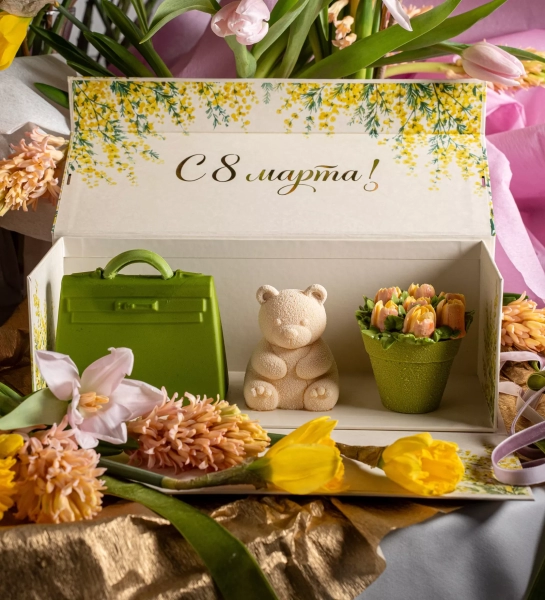 Кондитерская Kalabasa в предпраздничные дни становится заметно популярнее одноименного ресторана на 2-м этаже – ведь тут появляется очередная лимитированная коллекция десертов с особенным дизайном. В этом году весенние торты украшены кремовой мимозой и сиренью, живыми цветами и сухоцветами, фруктами и ягодами. Если торт – слишком серьезный жанр, можно выбрать шоколадные или ванильные капкейки с цветами, мадленки и макароны (по 4, 8 или 15 штук), ассорти конфет ручной работы. Помимо сладостей в Kalabasa всегда есть приятные штучки для дома, которыми можно дополнить пирожные, веганские трюфели или свежевыпеченный хлеб со взбитым маслом и домашней икрой. В ассортименте – свечи, диффузоры, вазочки и подставки для столовых приборов.