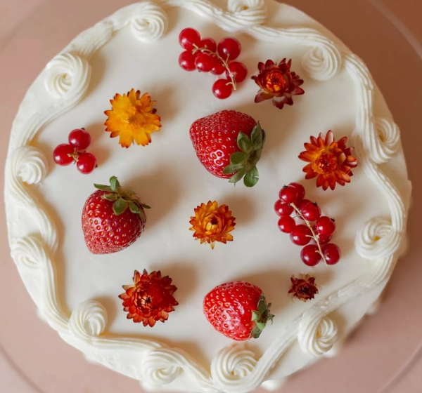 Торт, украшенный живыми цветами и ягодамиТорт, украшенный живыми цветами и ягодами