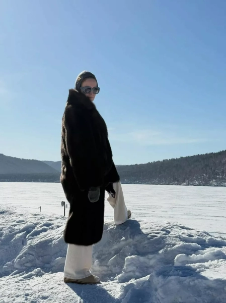 На снимках она позирует лежа на льду в длинной темно-коричневой шубе, уютных молочных джоггерах, уггах и полосатой цветной балаклаве в сочетании с солнцезащитными очками в стильной небесно-голубой оправе.