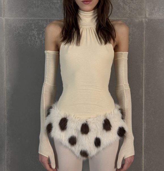 Самый тактильный пункт в списке – шорты молочного цвета в крупный коричневый горох. Здесь интересно все: от материала (мягкий эко-мех) до способа нанесения принта, который создается вручную. Это ироничная и смелая вещь для тех, кто любит нарушать правила. Сочетайте их с плотными колготками и грубыми ботинками или высокими сапогами – контраст пушистой текстуры и четкого гороха выглядит максимально свежо.